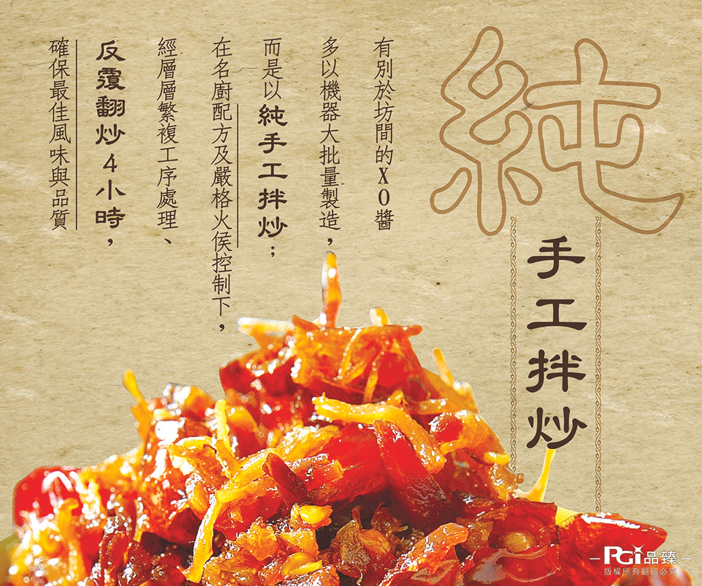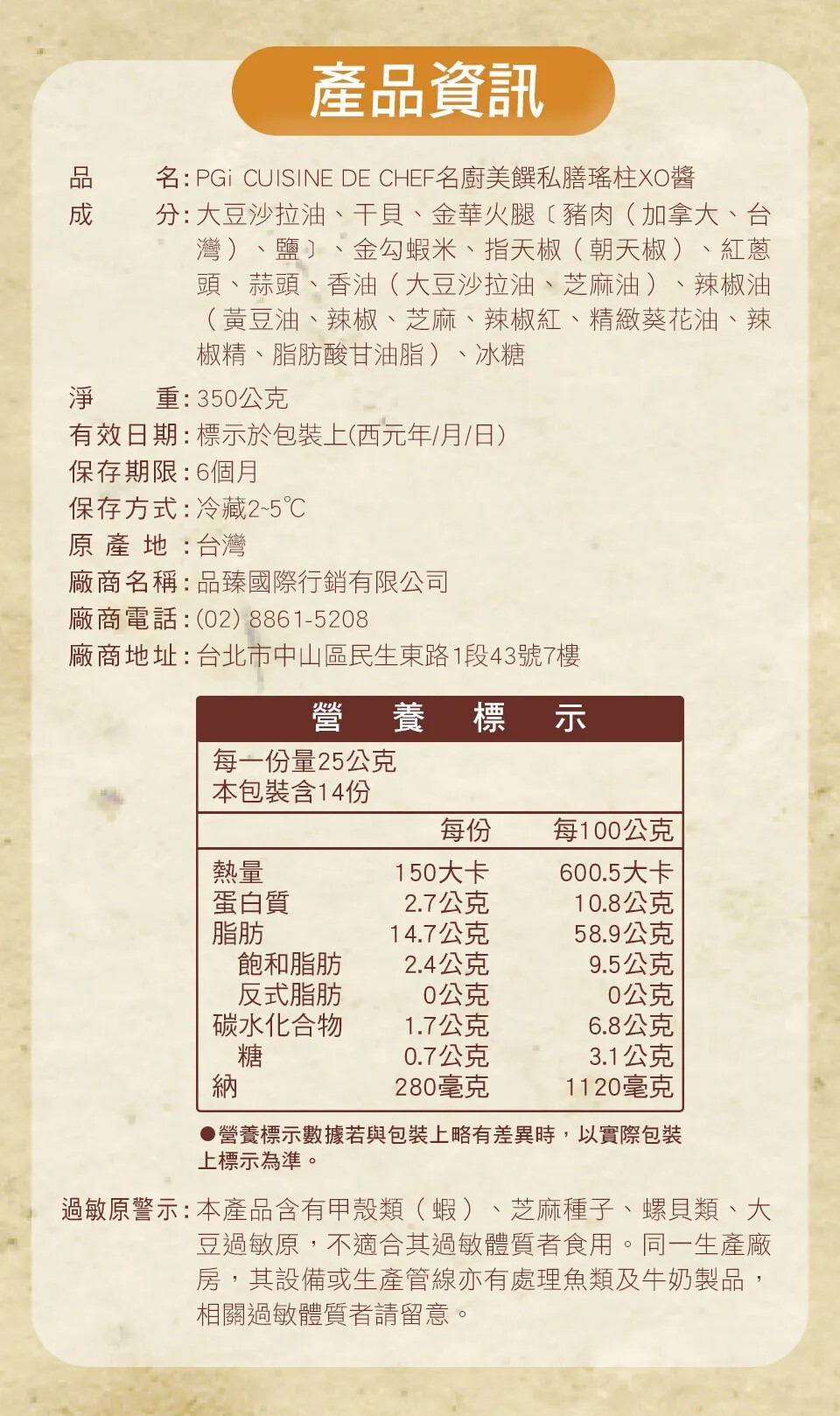 • 「名廚美饌-私膳瑤柱XO(激辣)展現了對極致風味的匠心追求。不同於大眾化的機器量產,這款XO醬堅持「純手工拌炒4小時」,透過慢火細活激發出瑤柱的鮮美與辣度的層次,確保每一罐都擁有頂級的品質與靈魂。