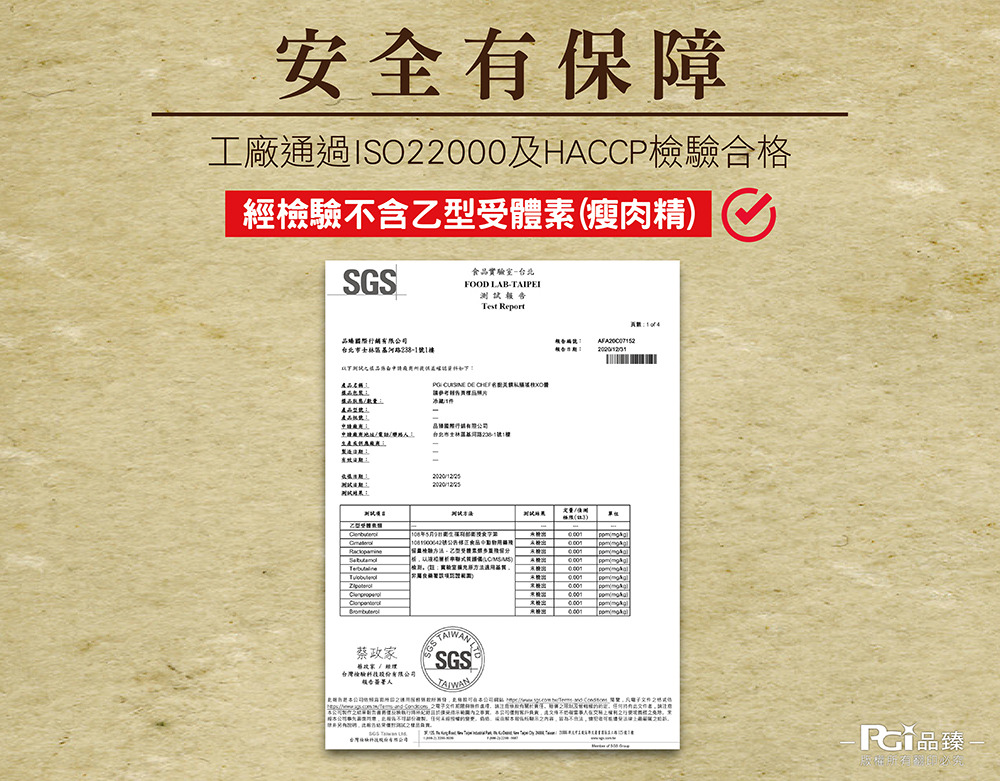 • 通過HACCPISO22000安全雙認證,經SGS檢驗不含瘦肉精,安全有保障讓您吃得美味又安心。