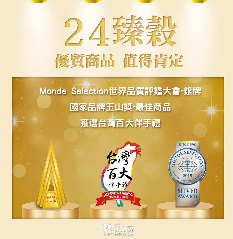 • 名廚美饌 24臻穀」是一款由多種天然禾穀原料精心調配的沖泡穀飲,每包結合24種穀物與豆類精華,採用非基因改造黃豆、糙米、青仁黑豆、黑芝麻、蕎麥、大麥、薏仁、紅豆、綠豆、米豆、花豆、碗豆、非基改玉米、松子、百果、核桃、蓮子、麥冬、淮山、芡實、茯苓、枸杞、百合、小米,呈現溫潤且飽滿的穀香風味。