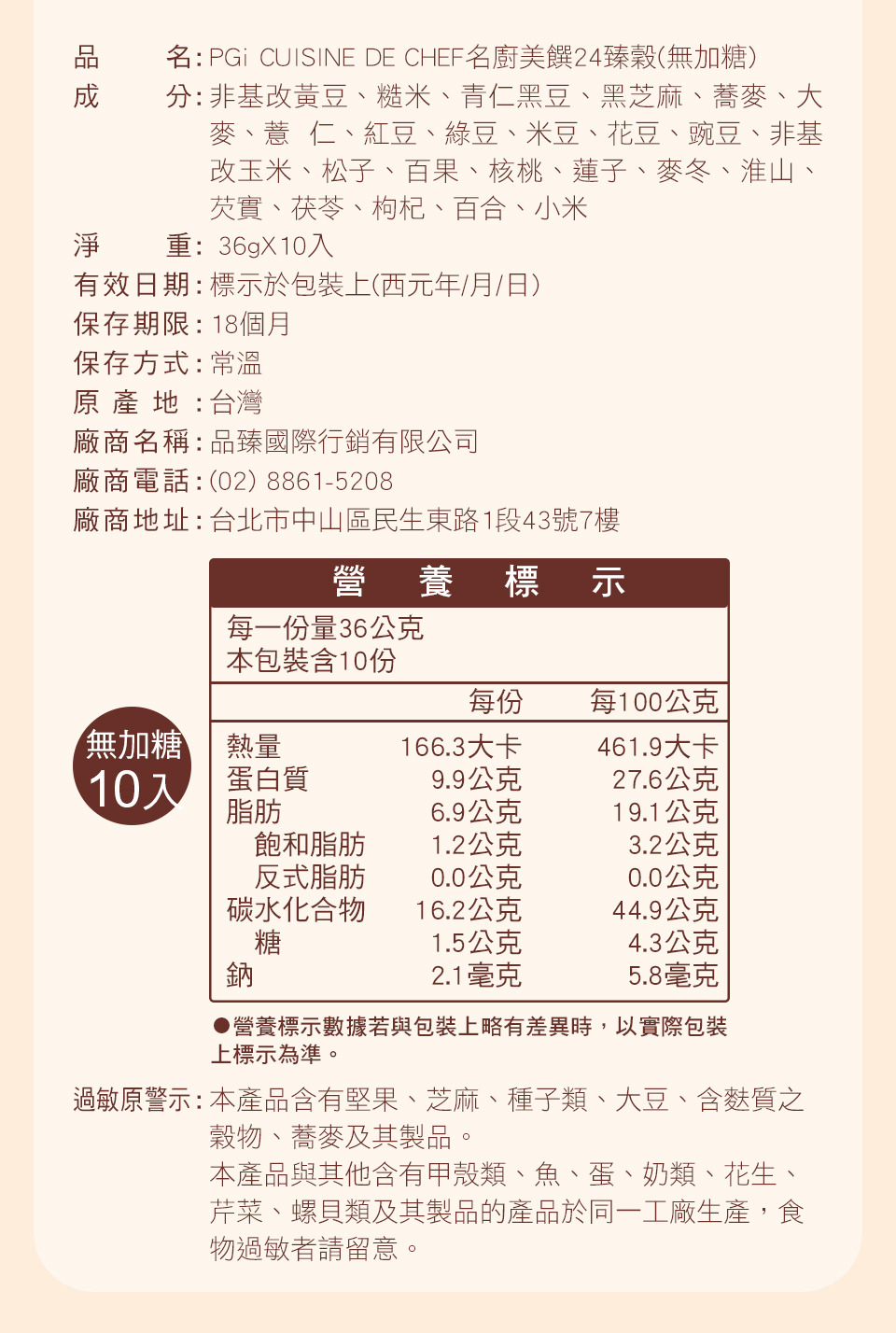 ※本產品含有堅果、芝麻、種子類、大豆、含麩質之穀物、蕎麥及其製品。