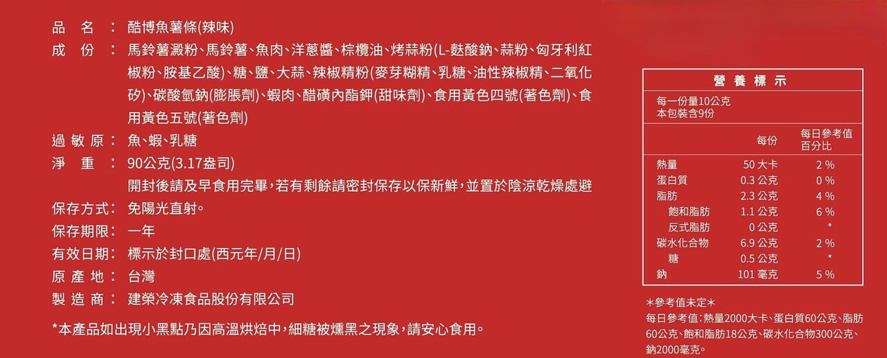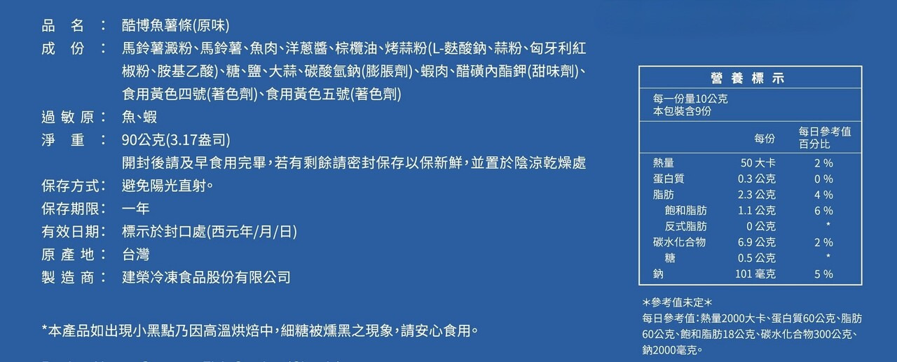 內容物成分:馬鈴薯澱粉、馬鈴薯、魚肉、洋蔥醬、棕欖油、烤蒜粉